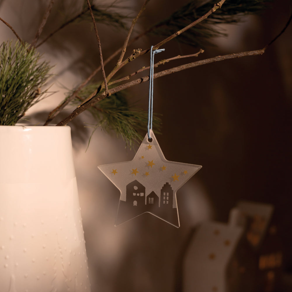 A beautiful glass hanging decoration. Star shaped, with a cityscape with gold stars over the rooftops. It pick up the light around it to glint and sparkle. Perfect against the deep green of the Christmas tree.
