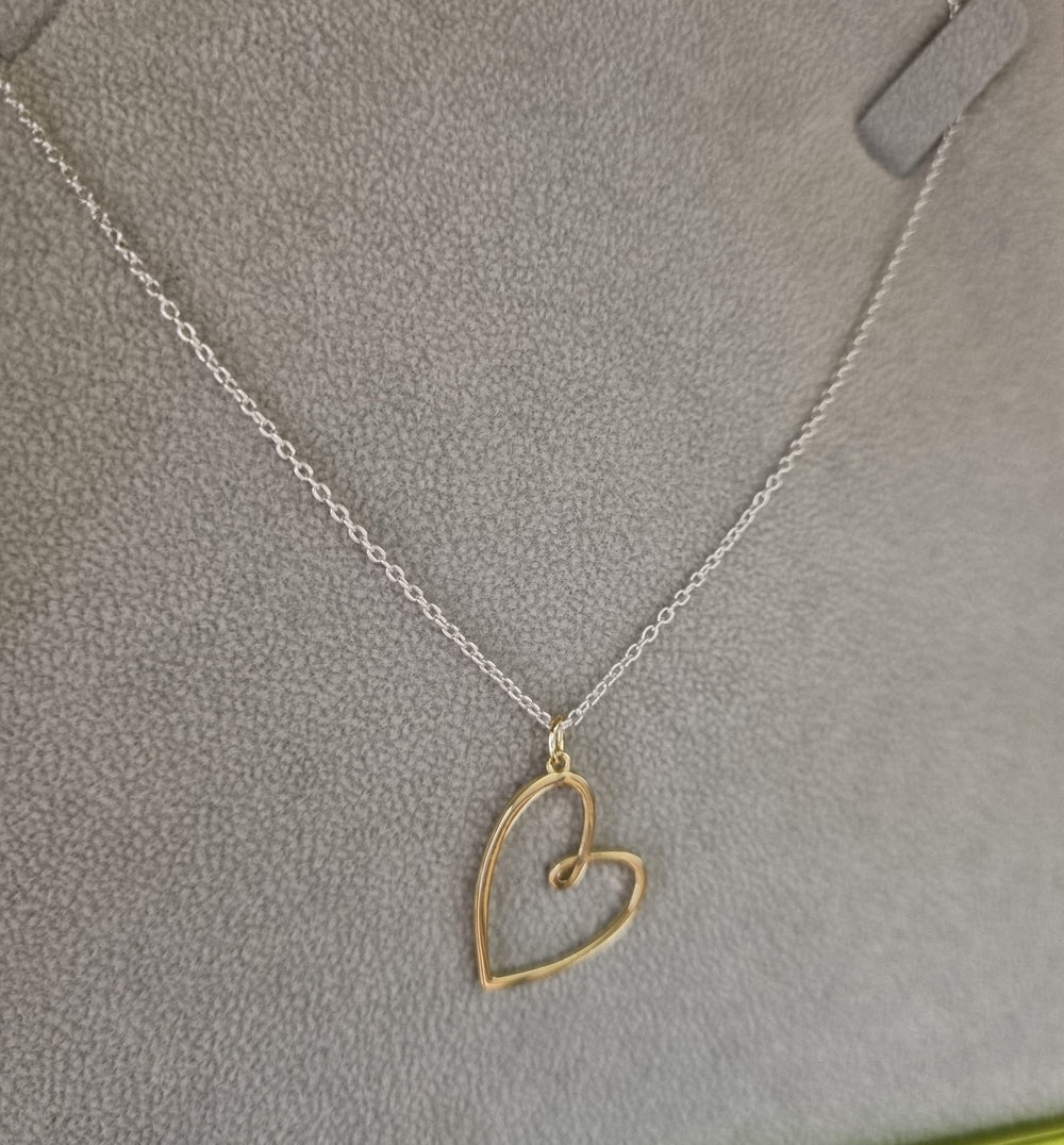 Elegant and simple this Looped Heart necklace in gold plated Sterling Silver sits beautifully on the neck and catches the light as you move. It is is lovely worn alone with simple necklines and can also be layered with other pieces.