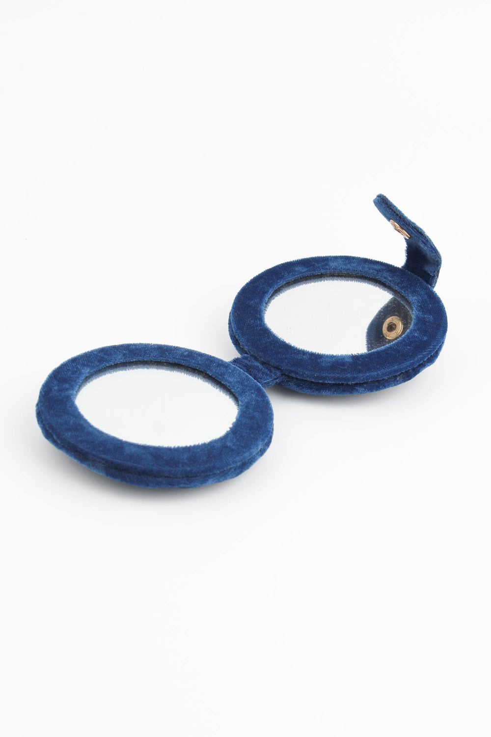Handy compact double-sided mirror, with a flip design and secure fastening. Intricate stitchwork and beaded gold stars and green snake design on plush deep navy velvet.