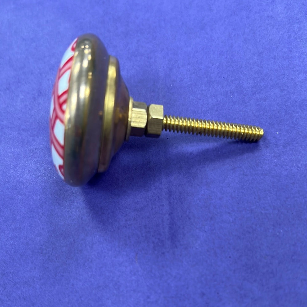 Ceramic door knob, 4cm diam, with brass coloured metal back plate, 2 washers and 2 nuts. Fits a maximum door/drawer depth of 2.3cm.