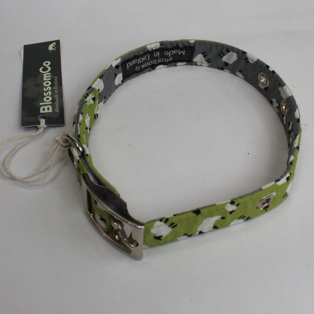 Not going to be too "woolley" in this description - this collar is green on the front and grey inside, and both sides are covered in delightful sheep!