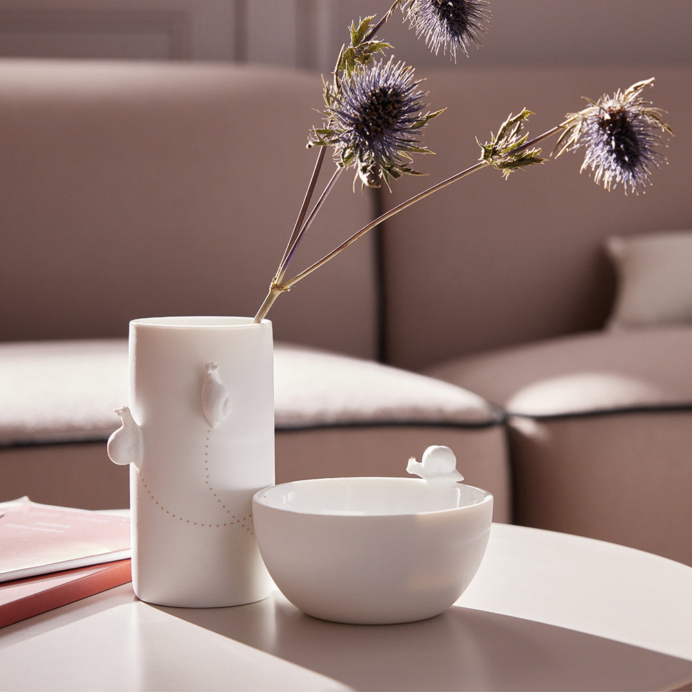 Small posy vase with 2 snails climbing up the side leaving fine gold trail behind them. Quirky but lovely item and could make an ironic gift for a gardener!