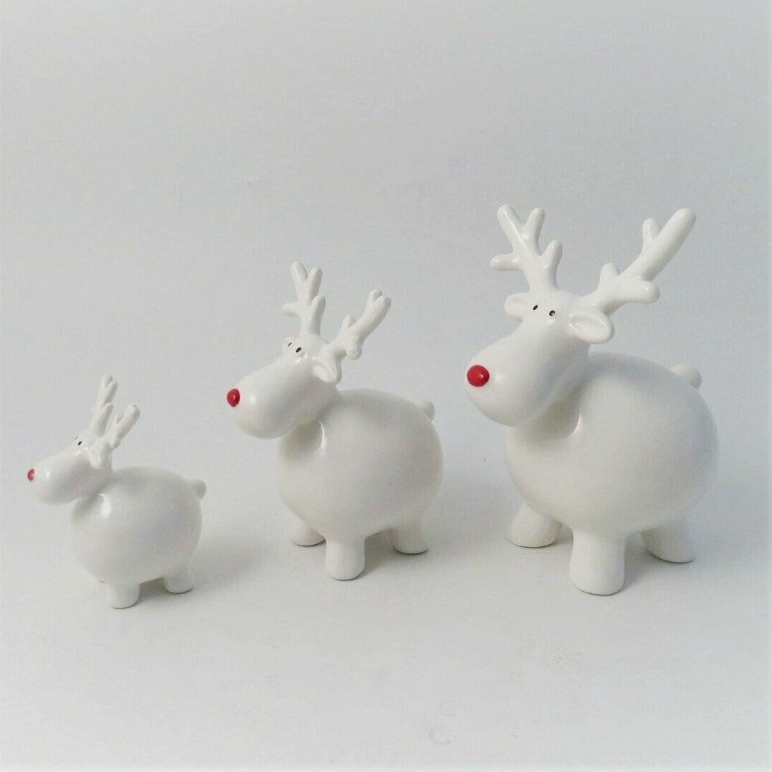 Chubby, cheery ceramic reindeer stands tall with a ruby-red schnoz!