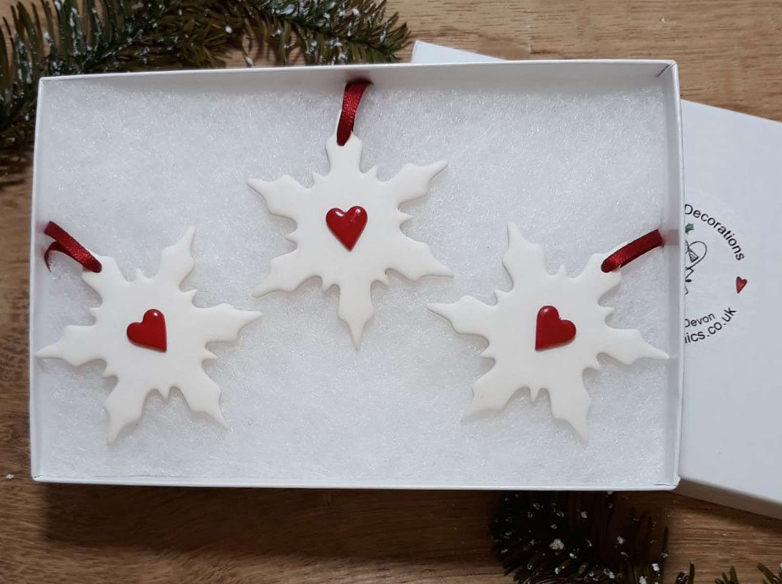 Trio Of Ceramic Snowflake Decorations -Red Heart