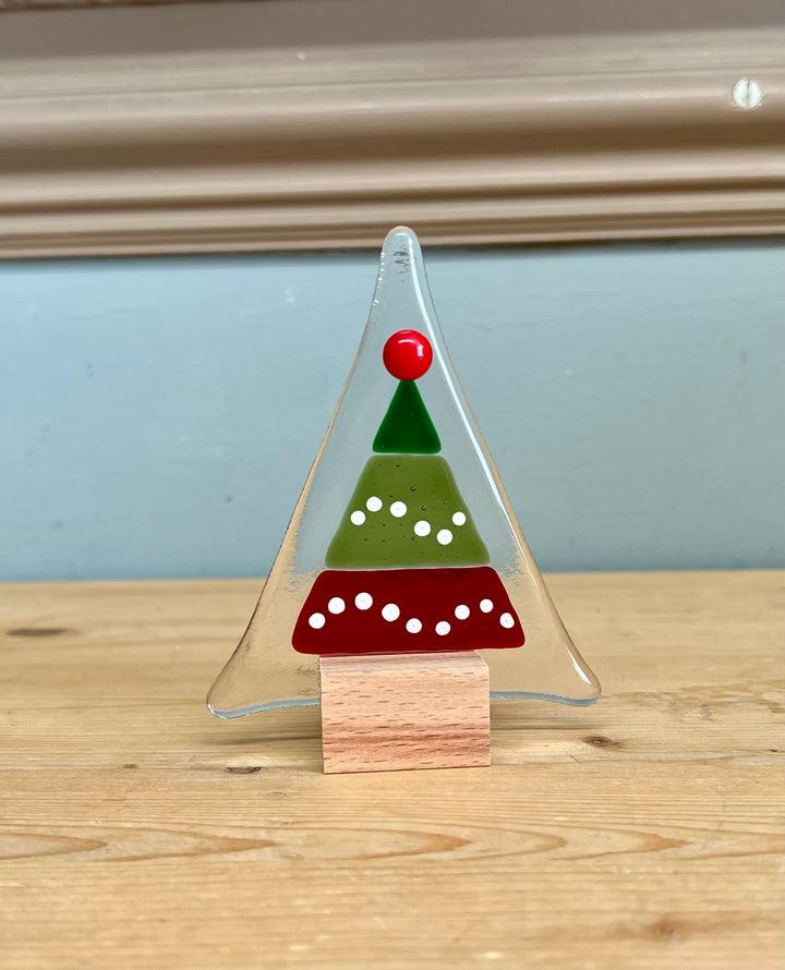 Fused glass art with a Christmas Tree design.  Handmade & designed by glass artist Jules Miller.