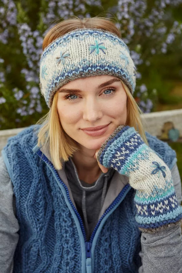 Women's hand knitted wool headband and ear warmer, with colourful and embroidered flower patterns.