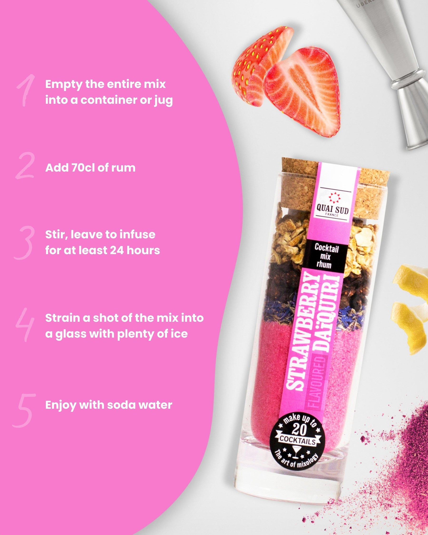 This pre-made cocktail mix includes all the flavourings you'll need to create a delicious strawberry daiquiri. Perfect for any rum lover, the strawberry daiquiri is a true classic. You can use light or dark rum in this cocktail. Just pour the ingredients into a jug. Add 70cl of rum and leave to infuse for 24-48 hours. Shake and filter. Can be enjoyed with club soda for a refreshing drink.