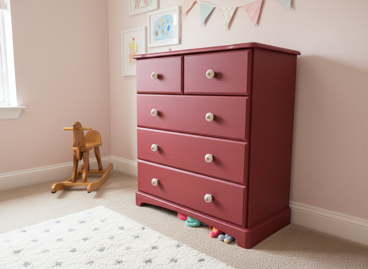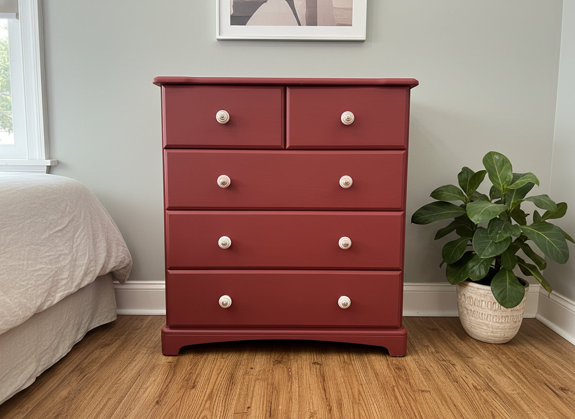 Professionally upcycled, painted in Frenchic 'Riad Red' from the new Limited Edition Al Fresco colour range. We have added colourful striped ceramic knobs (these can be changed if preferred). Drawers have been lined with geometric patterned wallpaper.