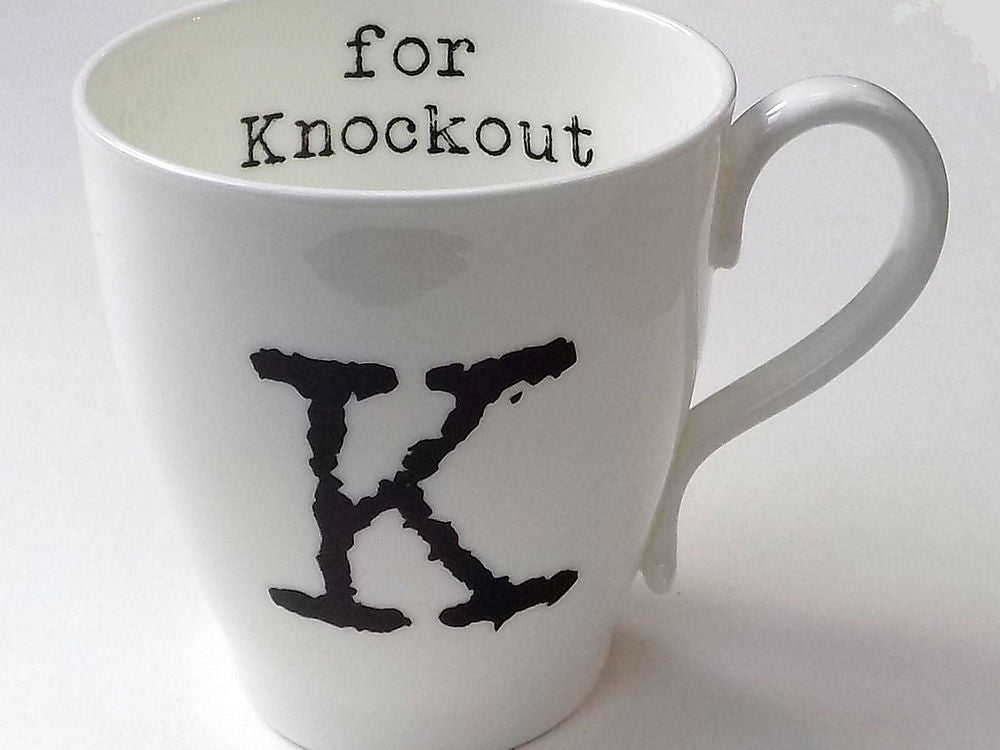 A fine bone china mug. It has a word or phrase beginning with the letter K, which is applied in a retro typewriter type face.  They have a thin lip, so are lovely to drink from. It is boxed so also perfect as a gift.