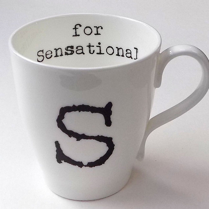 A fine bone china mug. It has a word or phrase beginning with the letter S, which is applied in a retro typewriter type face.  They have a thin lip, so are lovely to drink from. It is boxed so also perfect as a gift.