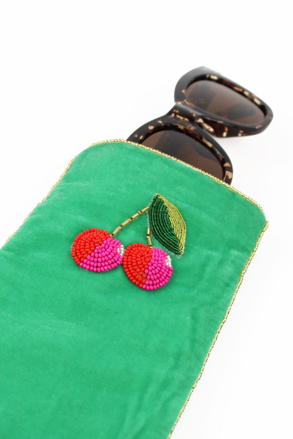 Fab bright case to hold glasses or sunglasses. Cherry motif intricately hand beaded on to plush bright green velvet. Finished with a contrast bead piping.
