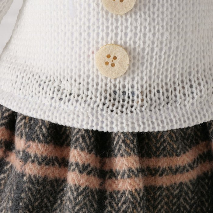 Super cute teddy figurine. Dressed smartly in her knitted cardigan with lace frill neck and checked skirt with her fluffy rabbit slippers finishing off the outfit.