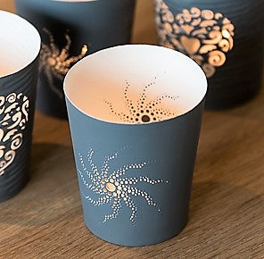 Made from powder coated metal. The design is cut by laser which makes for a detailed and uniformed design.  Please note it is not dishwasher friendly and is hand wash only.