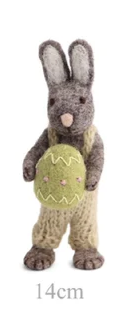 Grey Easter Bunny in Dungarees Holding An Easter Egg