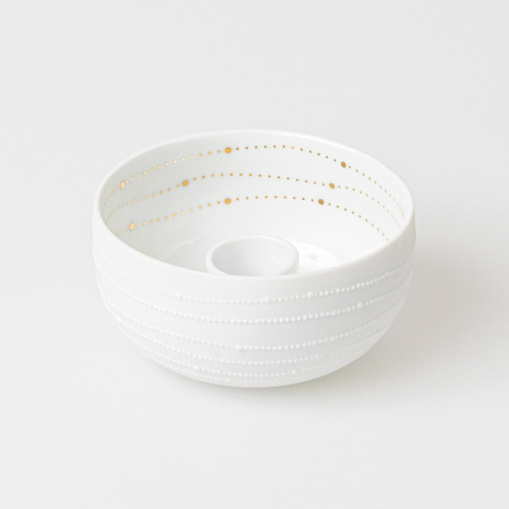 An elegant candle holder made from fine porcelain, made into the shape of bowl with gold embellishments and embossed pattern on the outside.