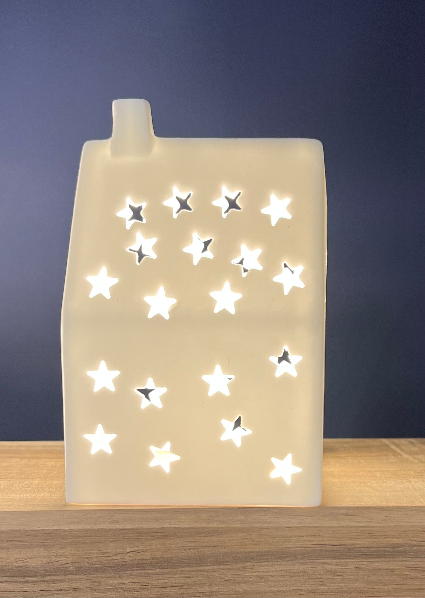 Elegantly handcrafted tealight holder, made from porcelain in the design of a house. With a tea light lit inside the stars glow.