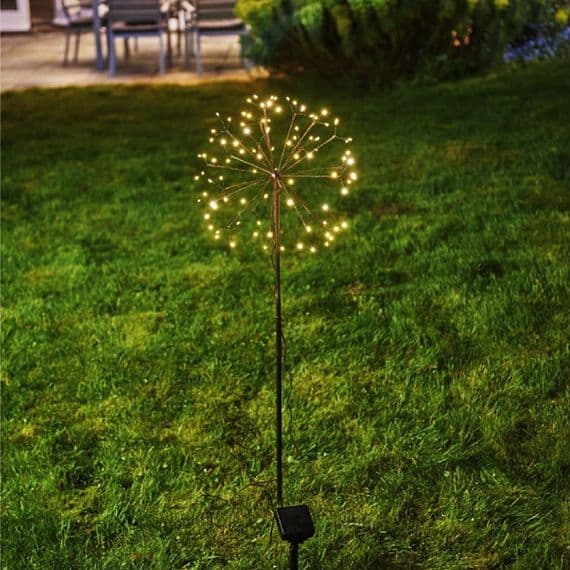 120 solar dandelion lights, give a warm white light and are powered by a rechargeable battery solar panel, connected via a generous 3m lead so you can hide the solar panel away from your display.