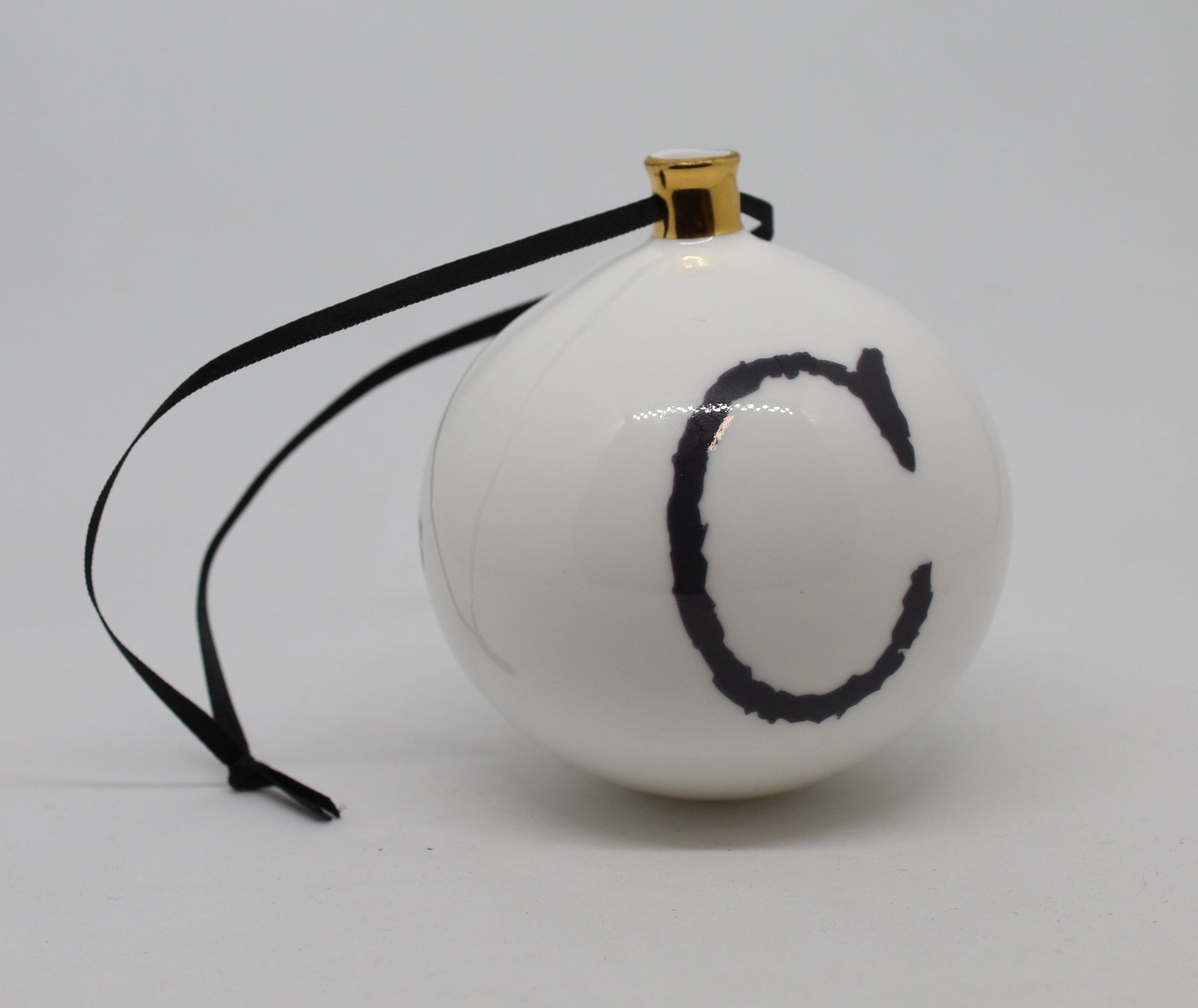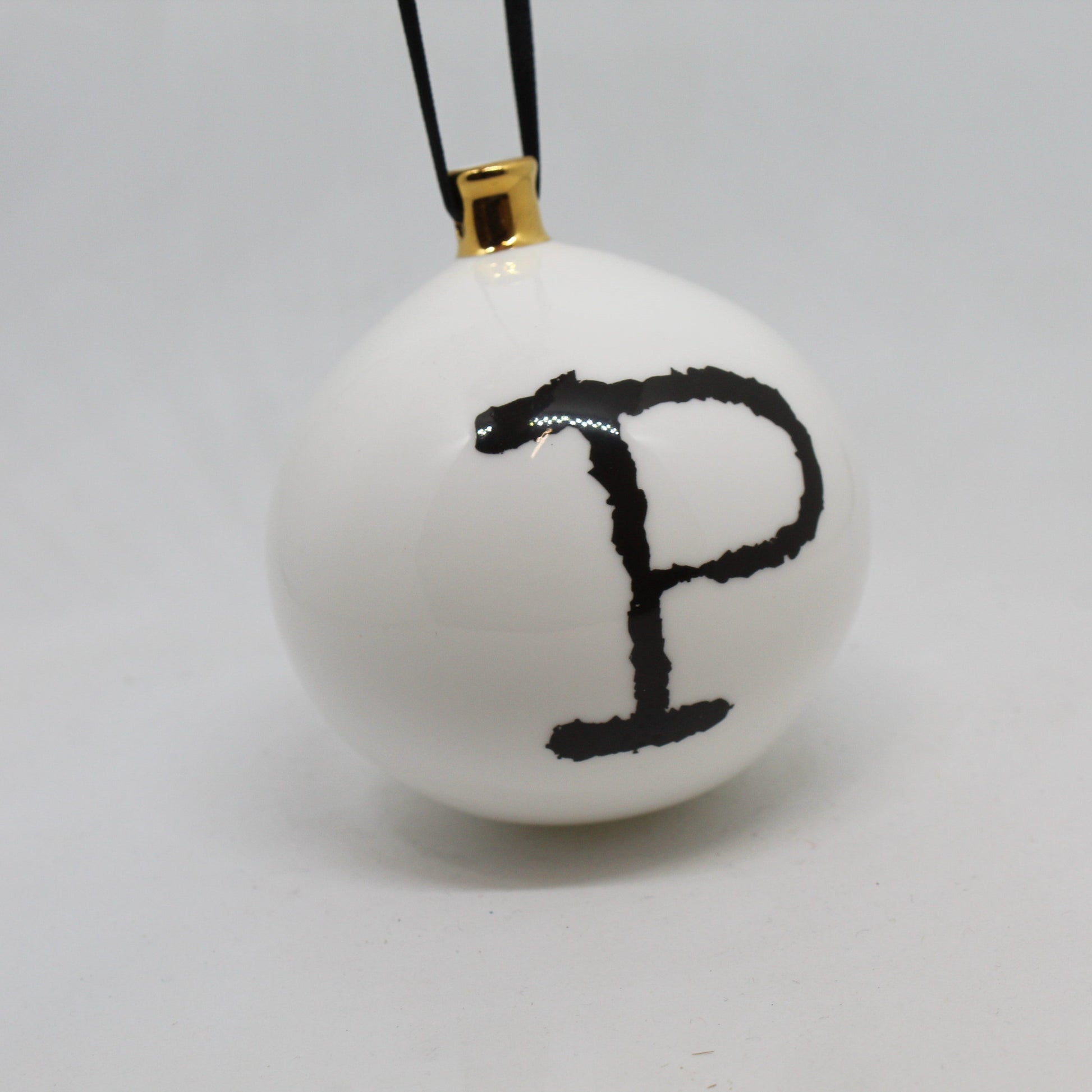 Handmade fine bone china bauble with real gold top on a quality fine bone china. With P for Present in retro typewriter font. These make a lovely gift and look great on your tree.