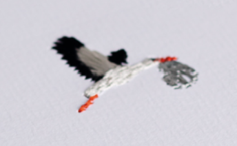 Colourful embroidered card depicting a stork carrying a precious bundle. A really lovely, unusual card to send a to new parents