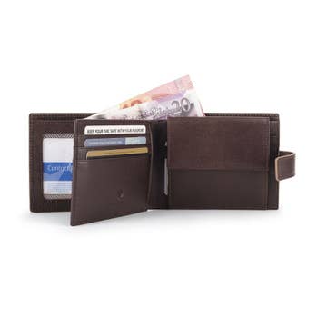 The Outback Bifold Wallet is a classic leather wallet with modern features. RFID protection technology, edge-dyed finish, and herringbone interior. Secured with a tab closure, this bifold includes a buttoned coin compartment, multiple slip pockets, 6 dedicated card slots, transparent ID window, and dual currency sections for organized storage.