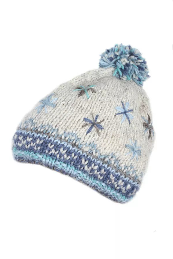Women's hand knitted wool bobble hat, with embroidered flowers and fleece lining.