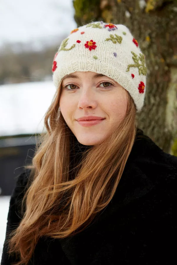 Women's hand knitted wool fair-isle patterned winter hat featuring beautiful hand embroidered flowers. An elegant addition to any wardrobe.