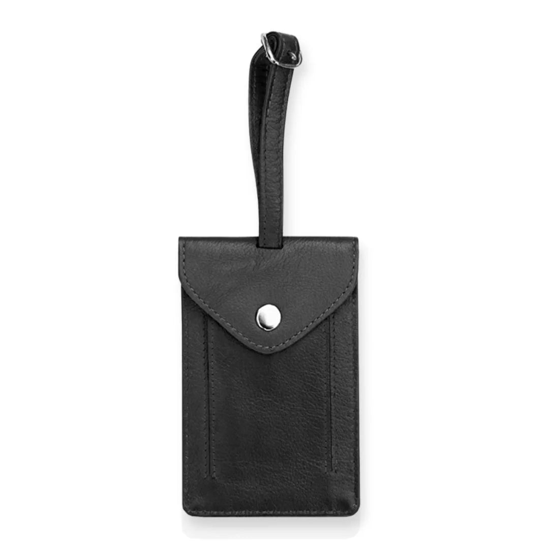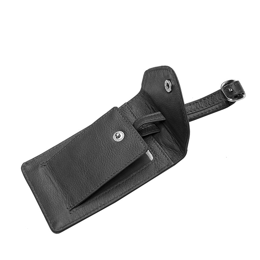 Leather luggage tag for the frequent traveller. For discretion, the address is covered with a flap secured with a popper