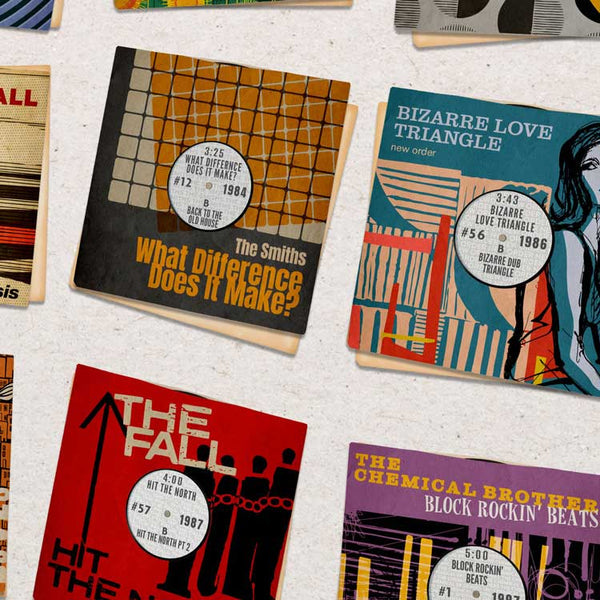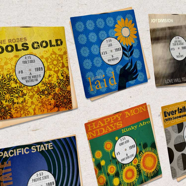 Made in Manchester Music Poster Print celebrates some of Manchester's best known singles. Each record cover has been re-imagined in an abstract modernist style with the details of each single release on the record's inner label.