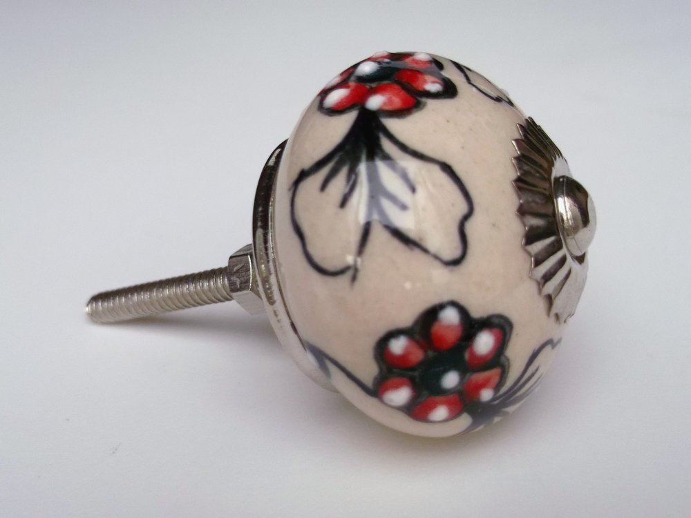 Ceramic door knob, 4cm diam, with silver coloured metal back plate, 2 washers and 2 nuts. Fits a maximum door/drawer depth of 2.3cm.