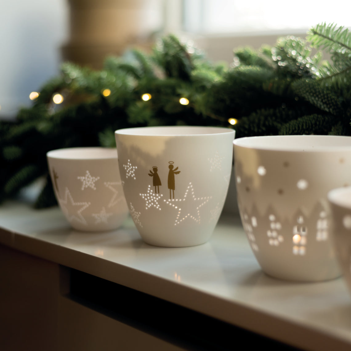 This delightful tealight holder is crafted from premier porcelain printed with gold decal angels and a lovely star-shaped pinhole design. Lit or unlit, it makes a statement in miniature.