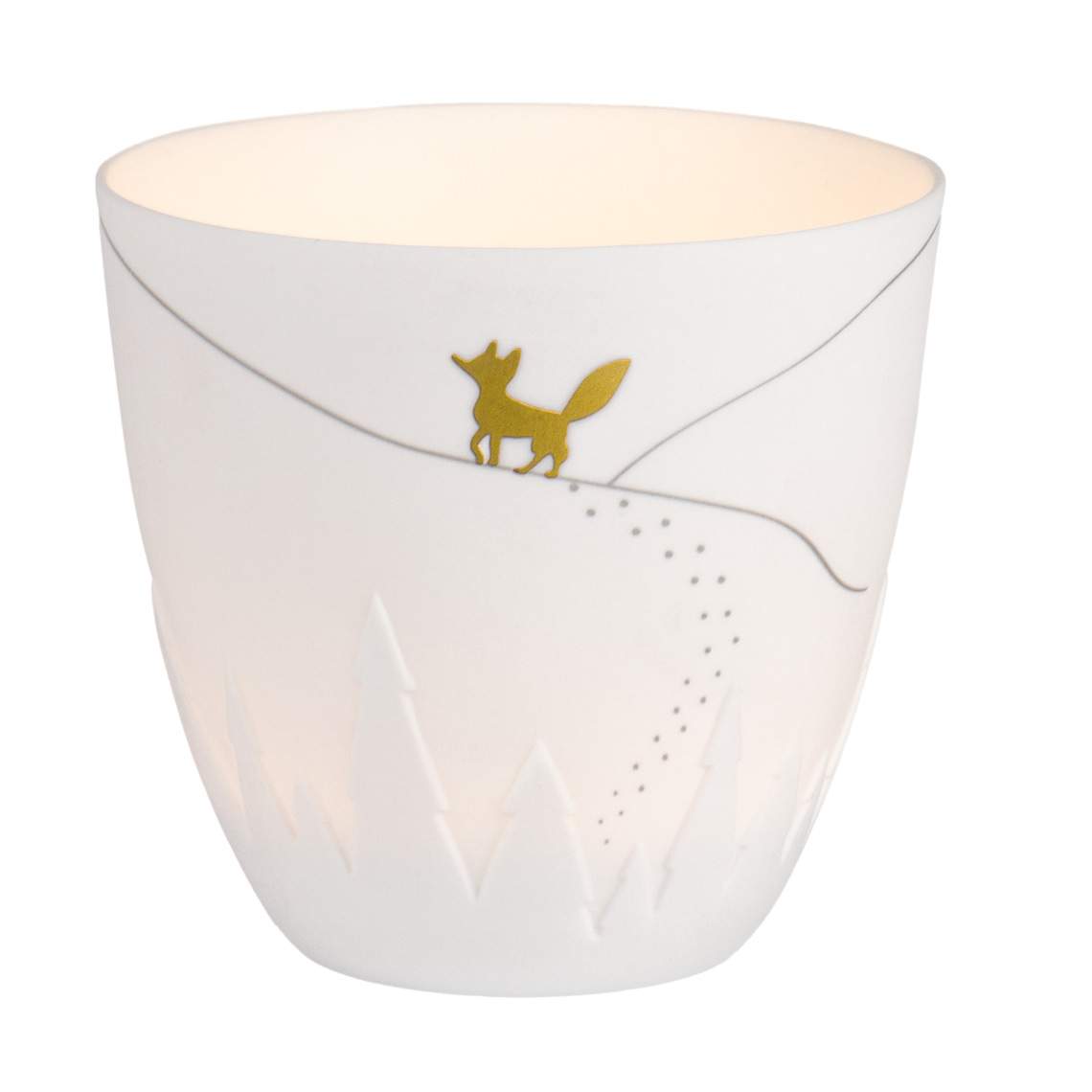This small poetry light made of wafer-thin porcelain is handmade and spreads a particularly delicate candlelight .It has a delightful image of a fox, in gold, walking through a winter scene. A candle on the inside gives it a warm glow and paints poetic pictures with its fine light points. For dreamers and stargazers, for cold night and warm evenings.