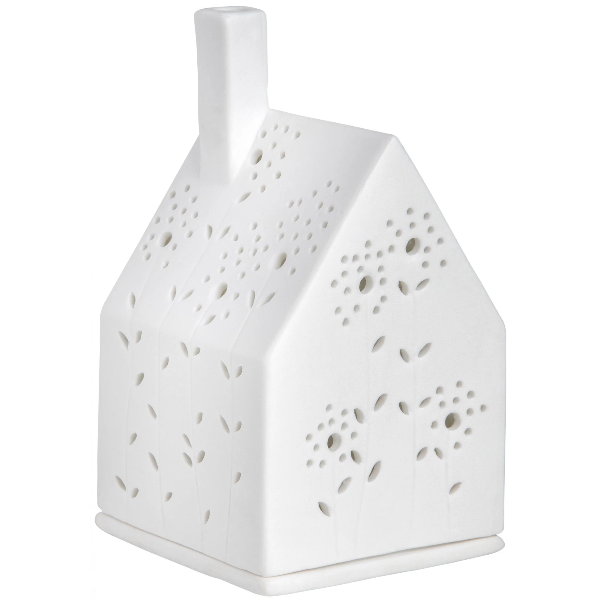 Small porcelain tea light house, which invites you to dream. It has cut out of flowers where the light of the candle can shine through. It looks so pretty!