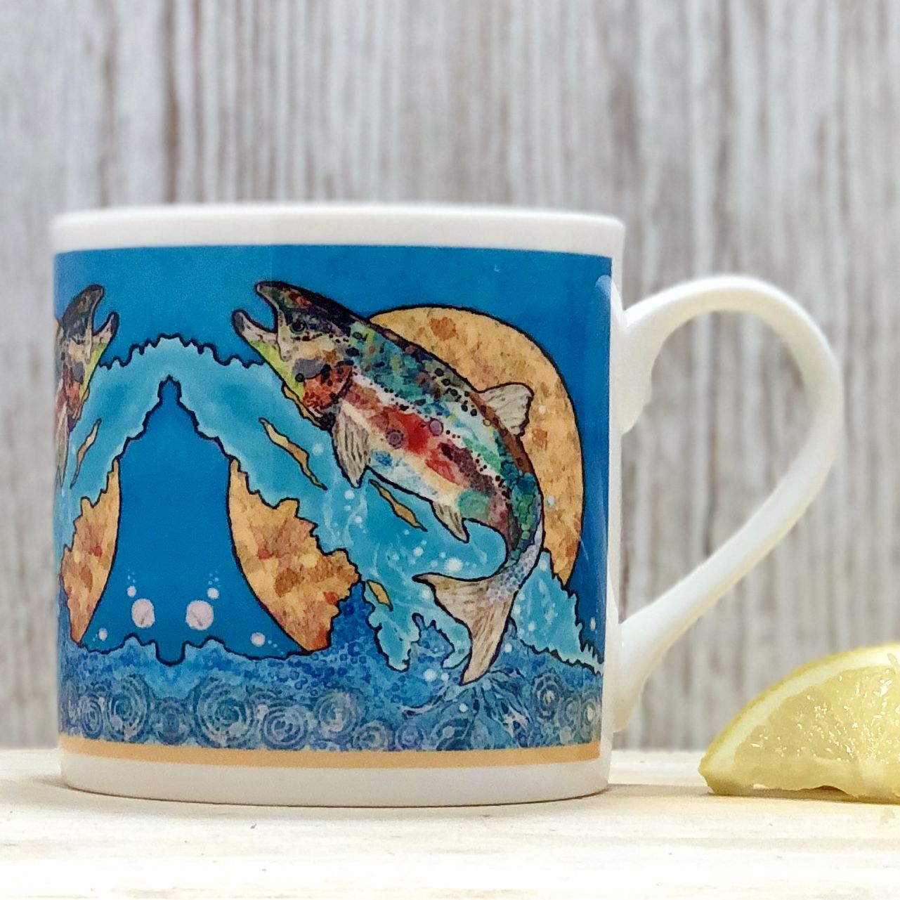 Bone china mug with a leaping salmon design reproduced from a unique torn paper collage.