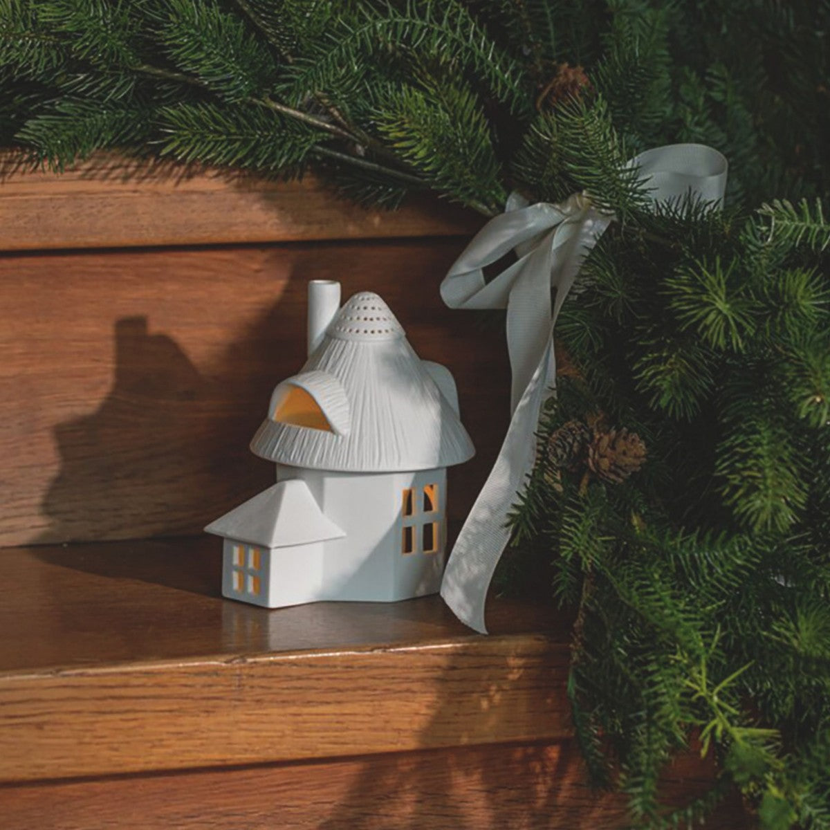 Tea light house made of the finest porcelain, made in the image of a thatched tower. The light glows through the delicate walls and through the windows.